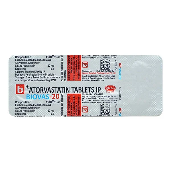 BIOVAS 20 mg contains Atorvastatin, which is a statin (HMG-CoA reductase inhibitor). This medicine is used to lower cholesterol and triglyceride levels in the blood. It helps reduce the risk of heart attack, stroke, and other heart-related complications in patients with risk factors such as diabetes, high blood pressure, or a family history of heart disease.