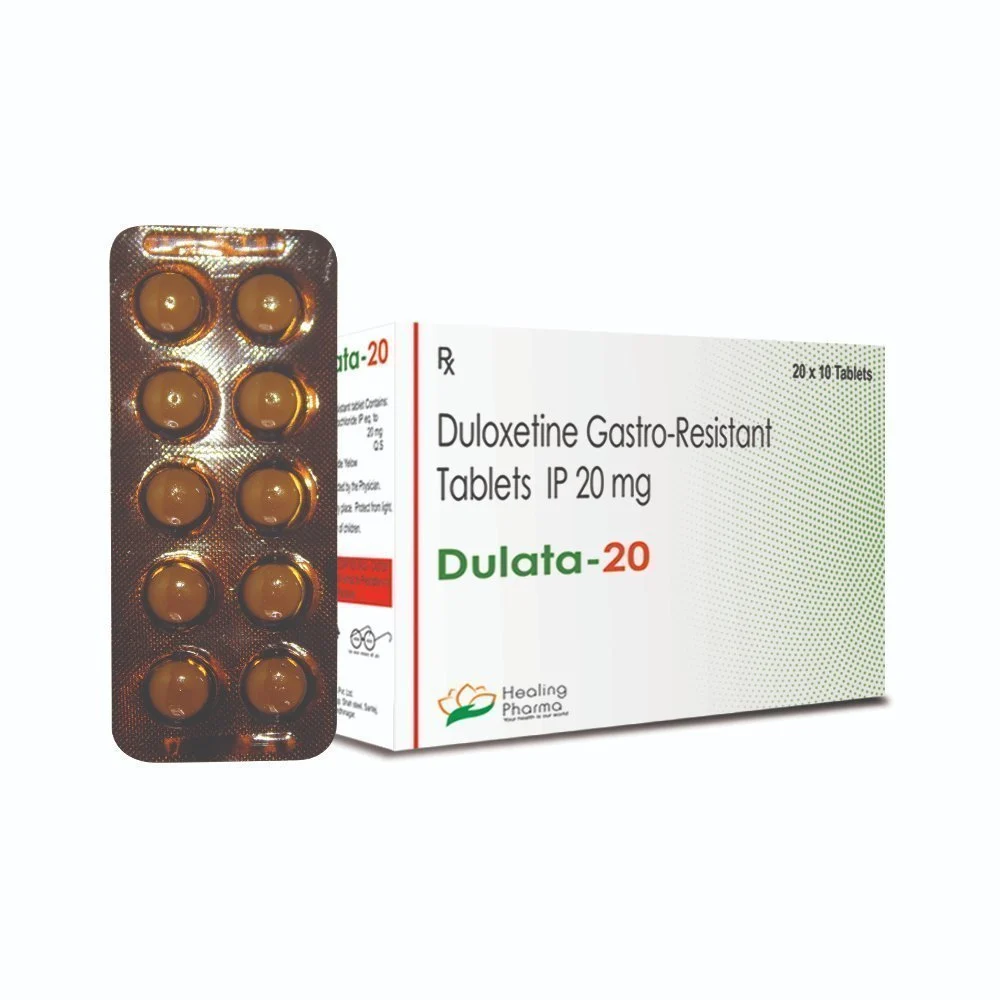 DULOXETINE (in Dulata 20 mg) is a serotonin-norepinephrine reuptake inhibitor (SNRI). It is used to treat major depressive disorder (MDD), generalized anxiety disorder (GAD), diabetic nerve pain, fibromyalgia, and chronic musculoskeletal pain (such as back pain or arthritis-related pain). It works by increasing the levels of serotonin and norepinephrine in the brain to help improve mood and reduce pain.