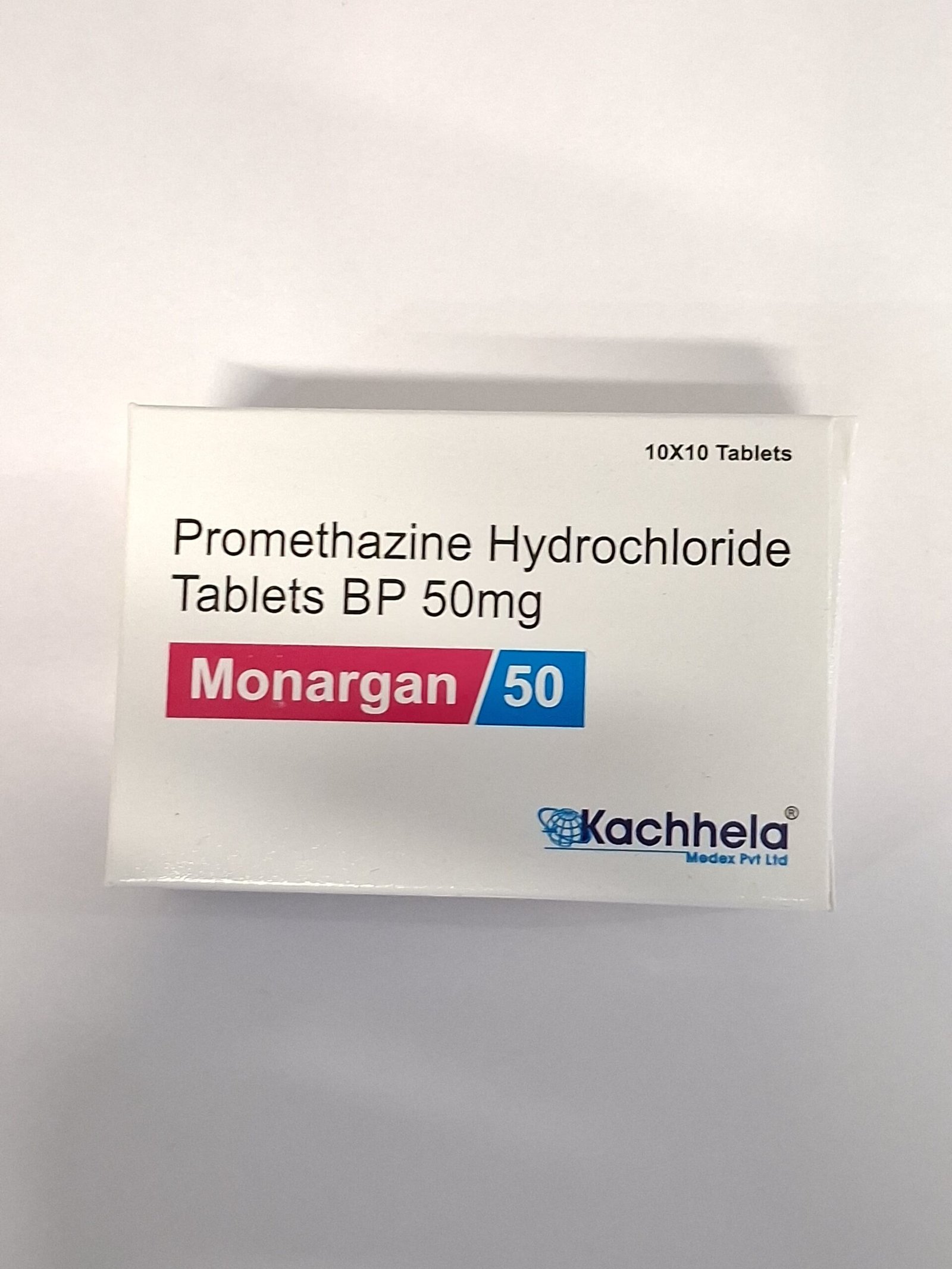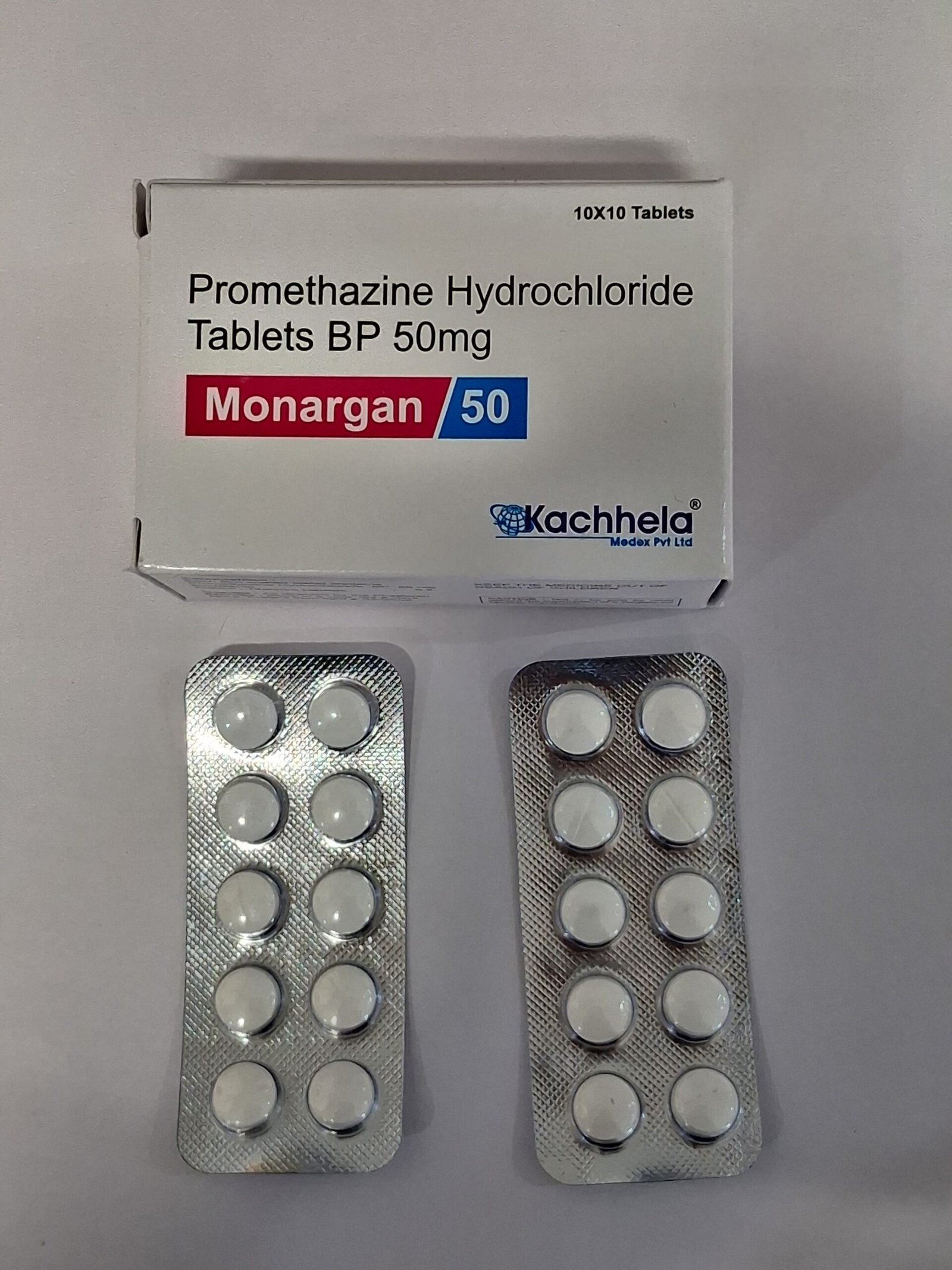 MONARGAN 50 mg contains promethazine hydrochloride, a first-generation antihistamine with sedative and antiemetic properties. It’s used to treat allergies (including hay fever and urticaria), prevent or relieve motion sickness, manage nausea and vomiting (e.g. post-surgery), and as a short-term sleep aid or sedative before procedures.