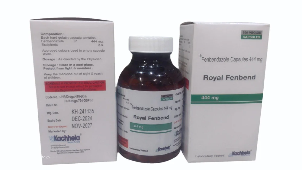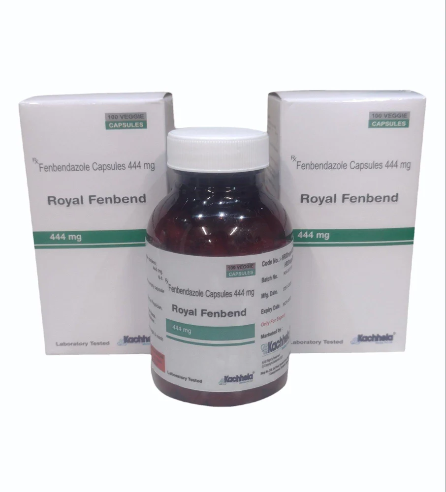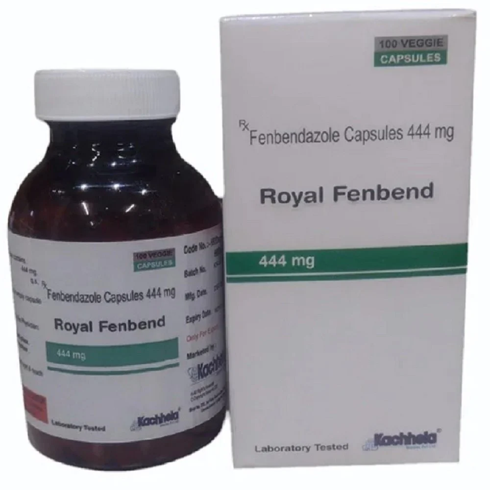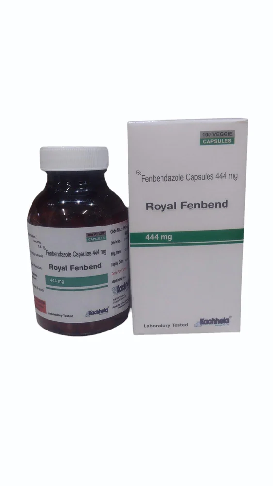 ROYAL FENBEND 444 mg is an anthelmintic (deworming) medicine containing Fenbendazole. It is used in animals to treat intestinal and some tissue parasites, including roundworms, hookworms, whipworms, some tapeworms, and lungworms. This medication is typically used in dogs, cats, and livestock for broad-spectrum parasite control.