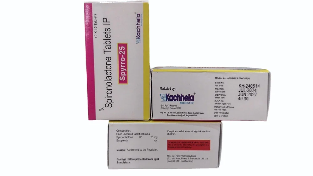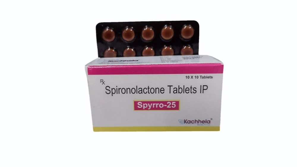 SPYRRO (Spironolactone) is a potassium-sparing diuretic (water pill) and an aldosterone antagonist. It is used to treat conditions such as high blood pressure, heart failure, edema (fluid retention), and certain cases of hyperaldosteronism. It may also be prescribed for patients with low potassium levels or for managing hormonal acne or hirsutism (excess hair growth) in women.
