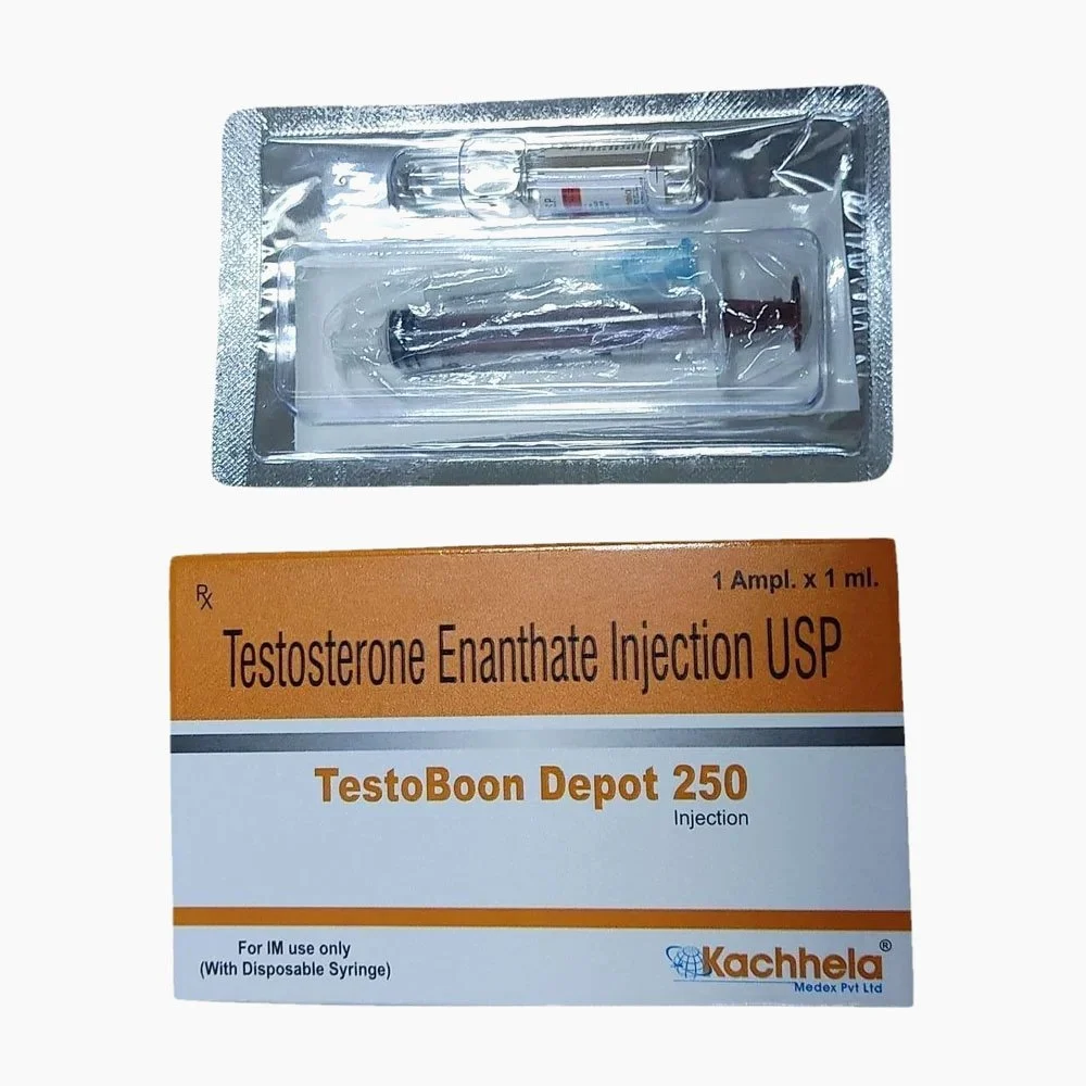 TESTOBOON DEPOT 250 mg Injection contains Testosterone Cypionate, which is an androgen (a male sex hormone). It is used in men to treat conditions caused by low testosterone levels, such as delayed puberty, impotence, or hormonal imbalances. It may also be prescribed for hypogonadism and andropause. It is not meant for use in women, especially during pregnancy or breastfeeding.